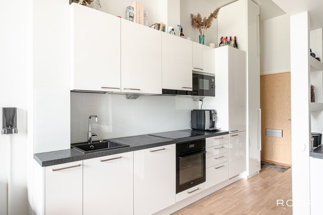 Hyvin varusteltu keittiö tarjoaa kaiken tarvittavan ruoanlaittoon, ja sen moderni ilme sulautuu kauniisti asunnon kokonaisuuteen.
