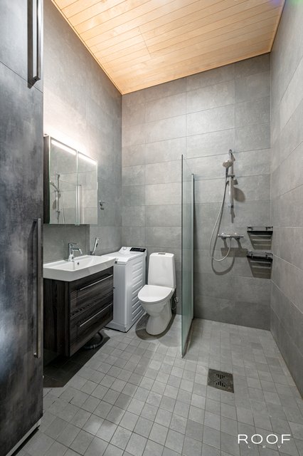 - WC-istuin, suihkuseinä, pesukoneliitäntä, peilikaappi, lattialämmitys, ja kylpyhuonekaapisto