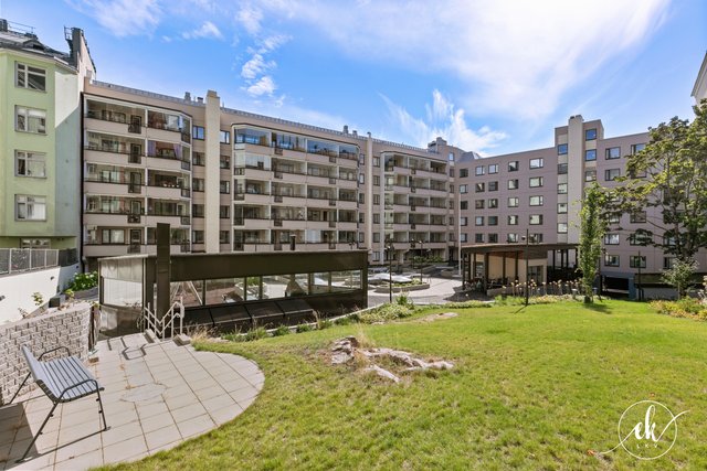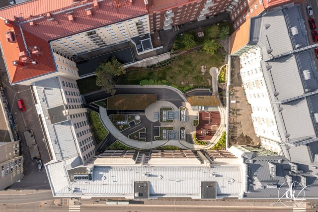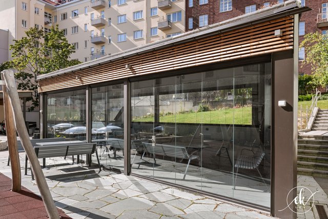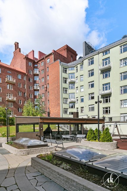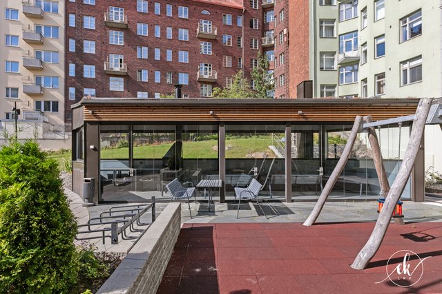 The housing company is well-maintained and has undergone several major renovations, such as facade and balcony refurbishments, and the installation of a charging system for electric vehicles. The courtyard is the gem of the neighborhood — a true oasis! It features beautiful plantings, play areas for children, and a stunning barbecue pavilion that completes the setting.