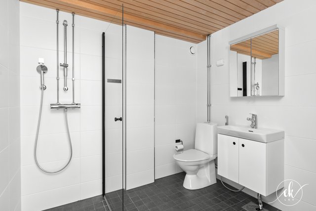 - WC-istuin, suihku, pesuallas, allaskaappi, pesukoneliitäntä, ja peilikaappi