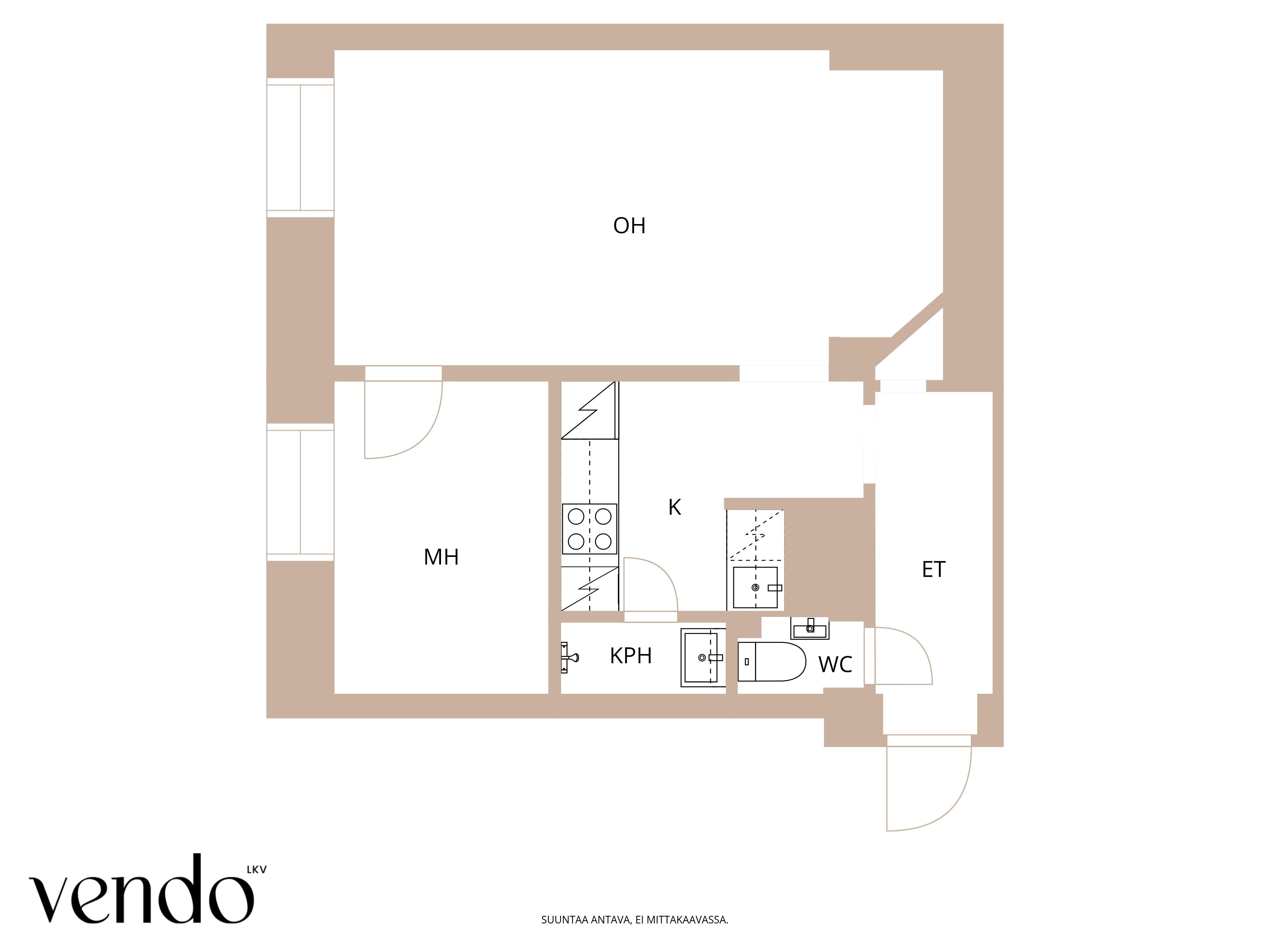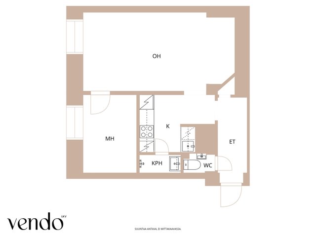- Jääkaappipakastin, erillisuuni, astianpesukone, liitäntä pyykinpesukoneelle (Taloyhtiön edellyttämä vuotovahti asennettu), ja liesituuletin (Aktiivihiilisuodattimella)