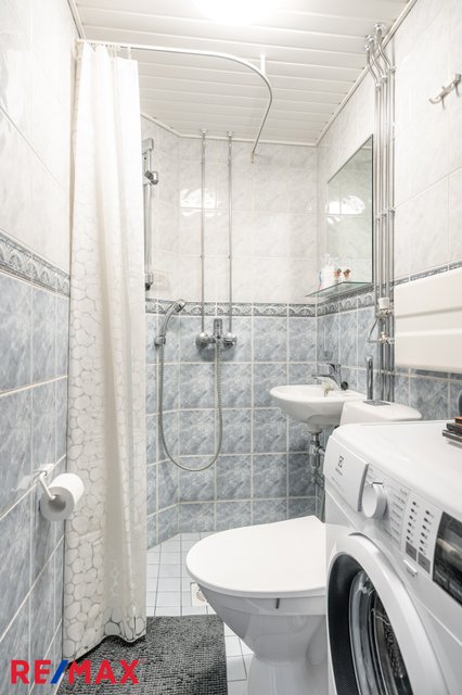 - WC-istuin, suihku, pesukoneliitäntä, pesuallas, bidee-suihku, ja peili