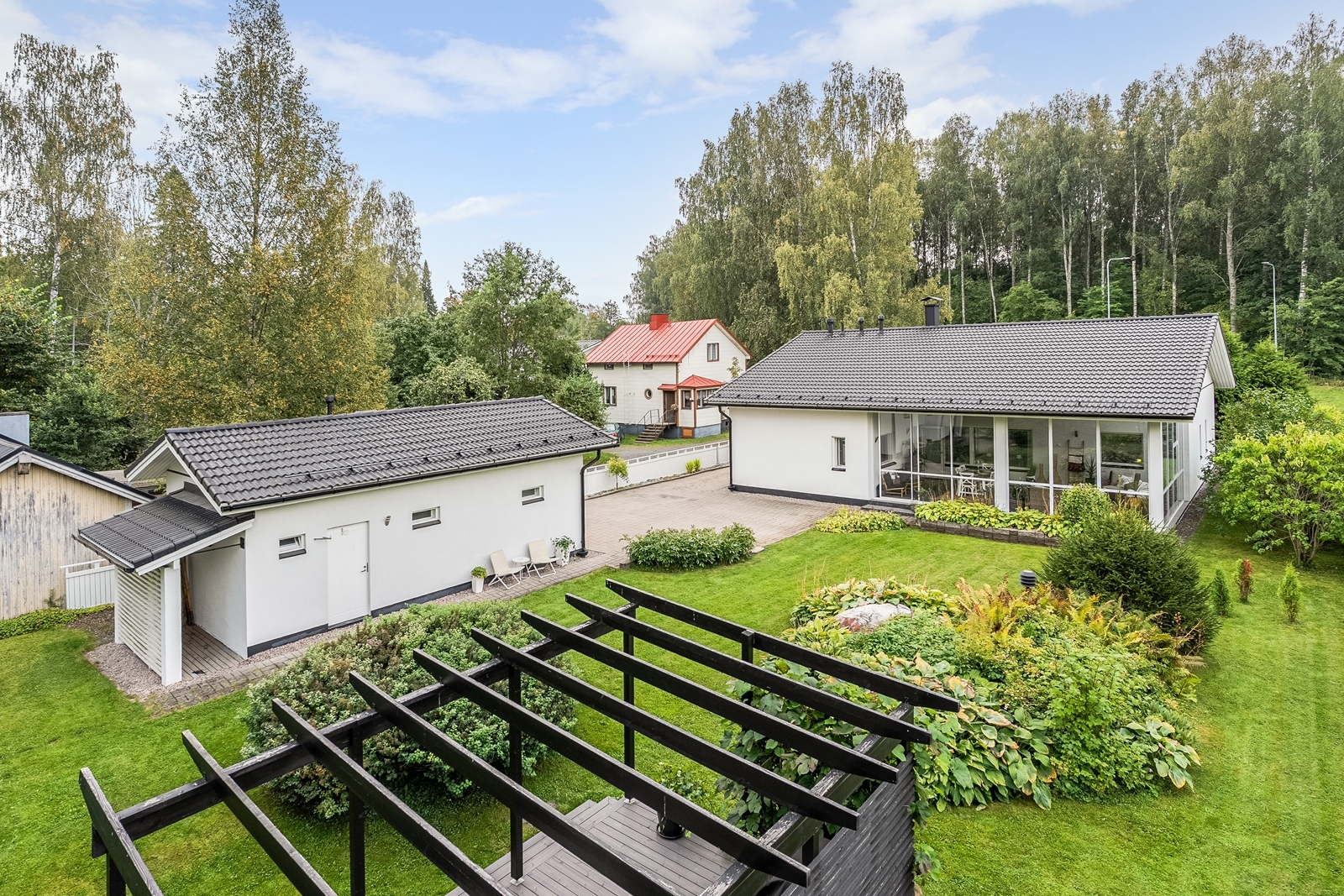 Pihapiiriin kuuluu myös tilava 45 m² talousrakennus, jossa on lämmin autotalli sekä runsaasti varastotilaa.