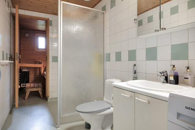 - Suihku, pesukoneliitäntä, wc-istuin, lattialämmitys, peilikaappi, allaskaappi, bidee-suihku, ja suihkuseinä
