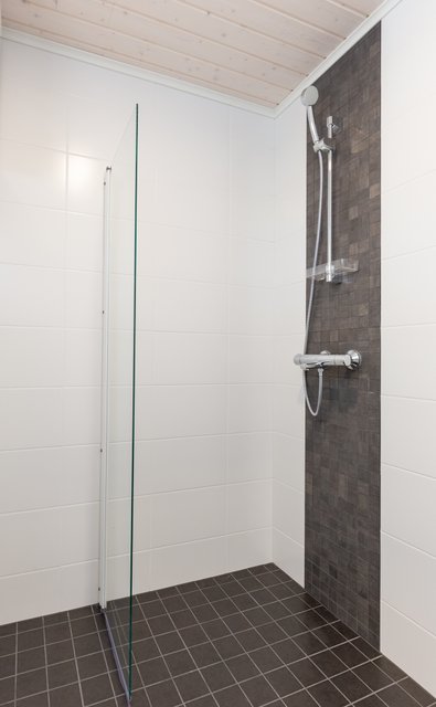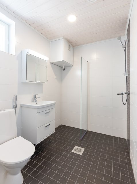 - Suihkuseinä, pesukoneliitäntä, lattialämmitys, wc-istuin, suihku, ja peili