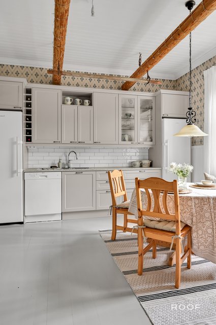 Lattiat ovat puuta, ja asunnossa on avotakka. Tämä koti huokuu rakennuksen satavuotista historiaa ja ainutlaatuista tunnelmaa.
