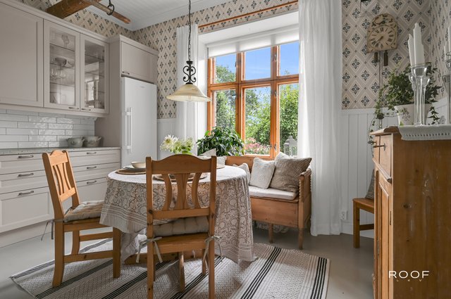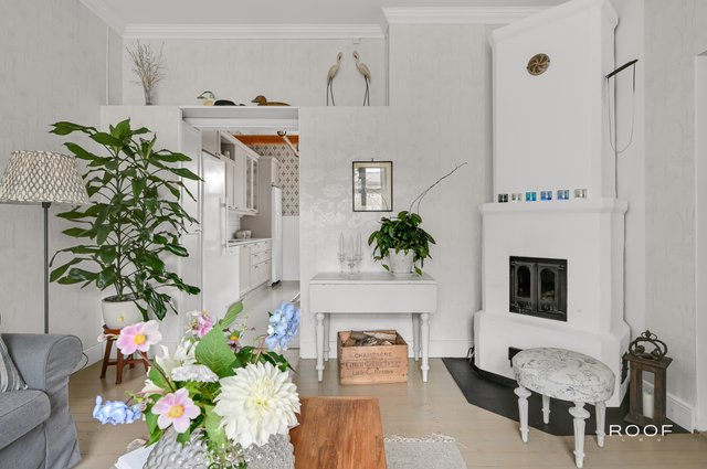 Trägolv, öppen spis. En bostad med karaktär och själ, som vittnar om byggnadens 100åriga historia.