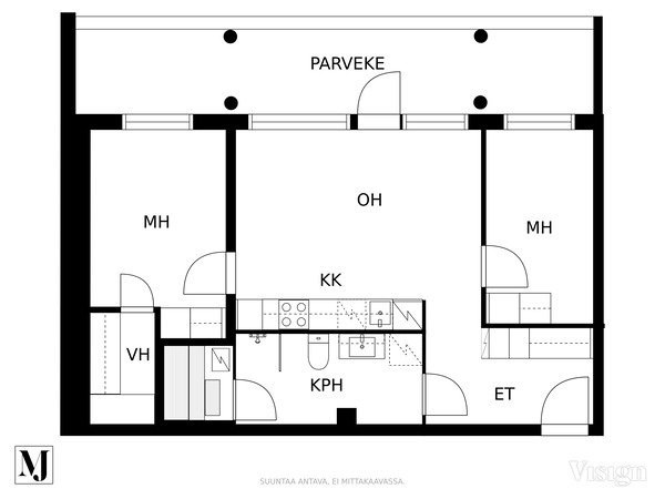 Keittiö olohuone muodostavat yhtenäisen avaran tilan ja kodin kaksi makuuhuoneista avautuvat puiston puolelle. Keittiö on ajattoman tyylikäs. Korkeakiiltoiset kaapistot, kivitaso ja integroidut kodinkoneet luovat ajattoman ja tyylikkään kokonaisuuden. Olohuoneesta on kulku lasitetulle parvekkeelle, joka toimii kuin yhtenä lisähuoneena aikaisesta keväästä pitkälle syksyyn. Parveke on koko huoneiston levyinen ja ilmalämpöpumppu pitää huoneiston kesällä vilpoisena.