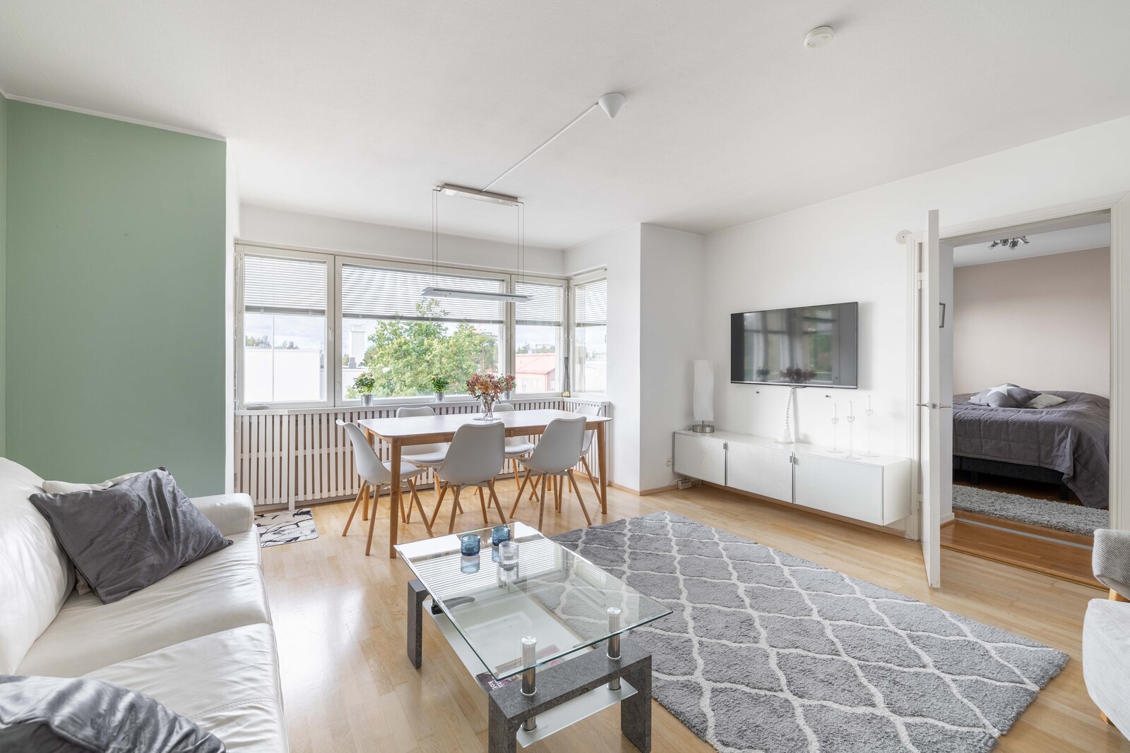 Valoisa ylimmän kerroksen kulmahuoneisto. Olohuoneesta ilmavat näkymät yli Haagan urheilutien. Olohuoneessa kaunis erkkeri. Erillinen keittiö on remontoitu ja sinne mahtuu mukavasti aamiaispöytä. Molemmat makuuhuoneet ovat erittäin tilavia. Huoneiston harmoninen värimaailma sopii varmasti monen makuun.