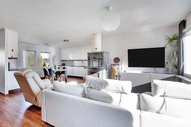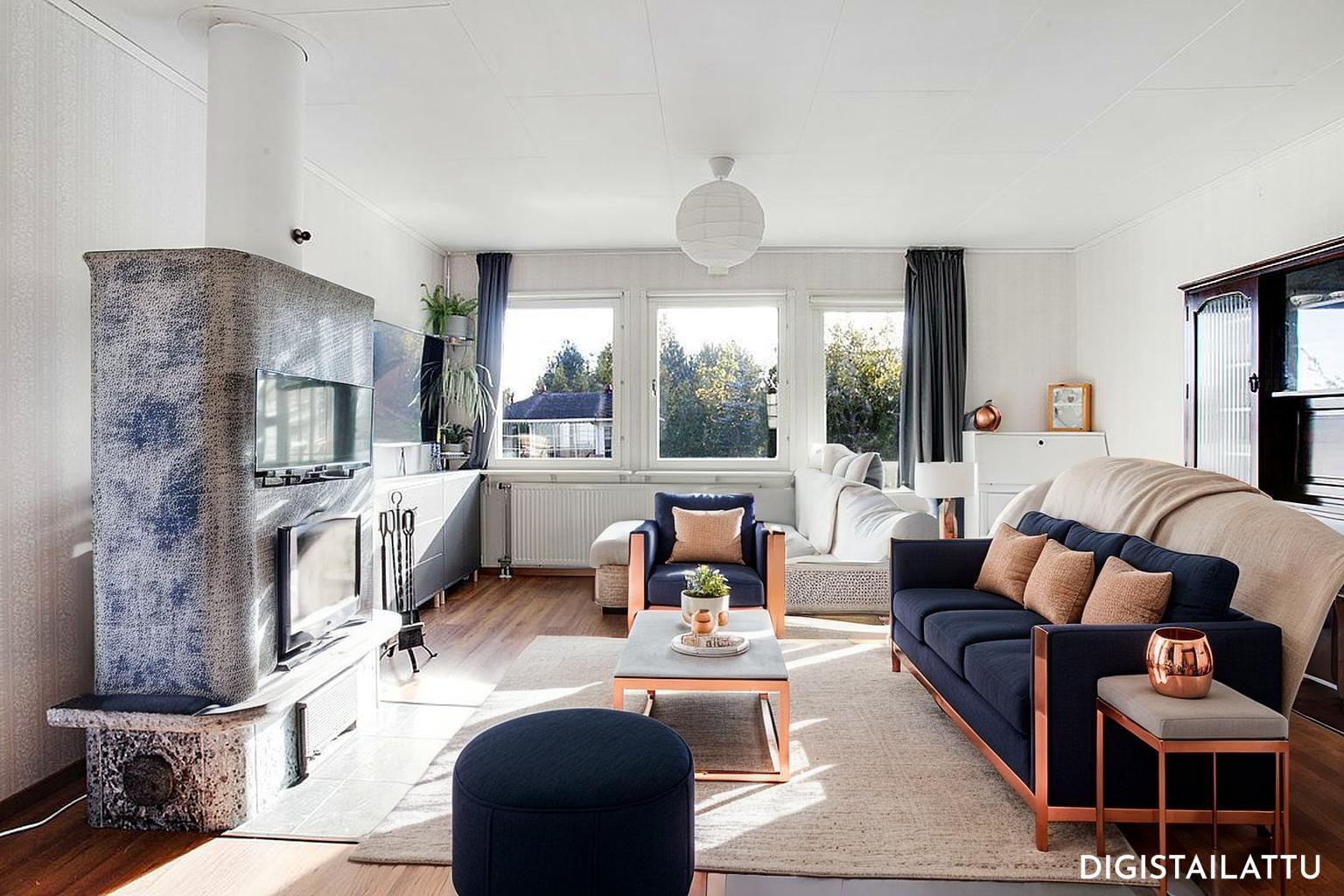 Asunnossa olohuone yhdistyy kauniisti keittiön kanssa. Olohuoneessa on varaava takka, joka säästää asumiskustannuksia ja tuo tunnelmaa pimeneviin iltoihin ja pakkasiin.