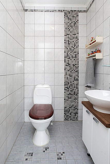 - Erillisessä wc:ssä wc-istuin, lavuaari ja allaskaappi. Seinät ja lattia laatoitettu.