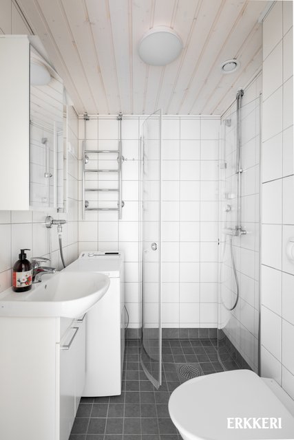 - WC-istuin, suihku, peilikaappi, pesukoneliitäntä, suihkuseinä, pesukone, bidee-suihku, allaskaappi, pesuallas, ja lattialämmitys