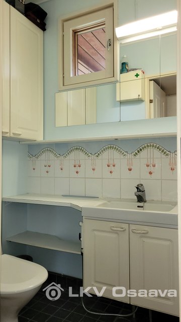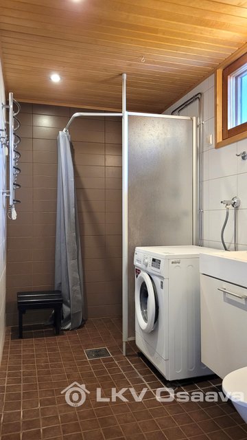 - Suihku, suihkuseinä, pesukoneliitäntä, lattialämmitys (Pesuhuoneessa), wc-istuin, ns. rättipatteri, allaskaappi, ja pesuallas