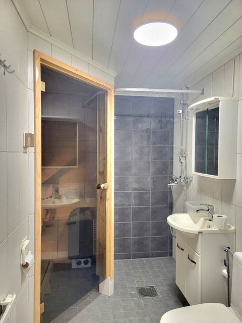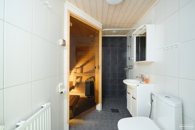 - WC-istuin, allaskaappi, peilikaappi, bidee-suihku, suihku, lattialämmitys, pesuallas, ja pesukoneliitäntä