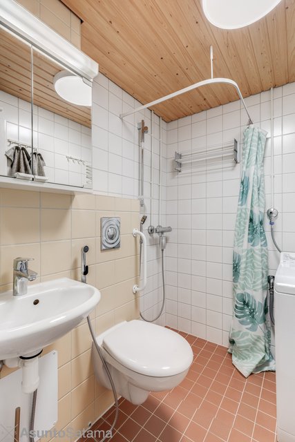 - Suihku, peilikaappi, pesukoneliitäntä, bidee-suihku, pesuallas, ja wc-istuin