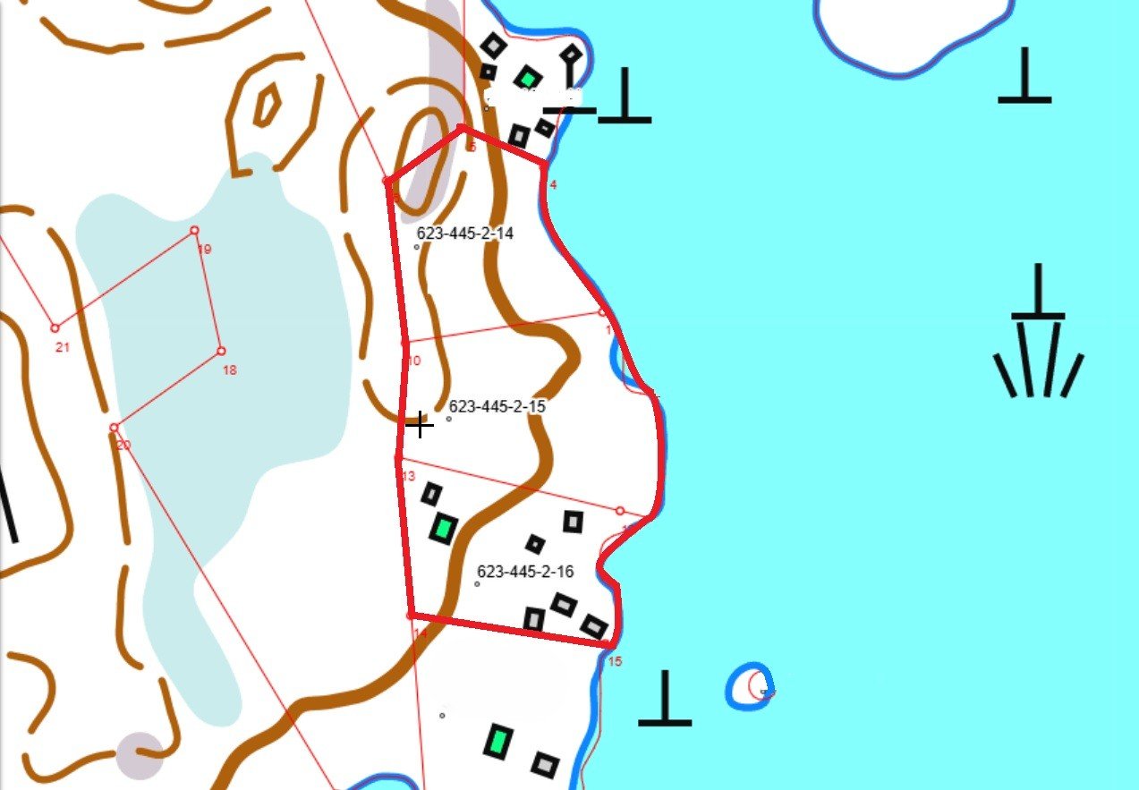 - Kolme kiinteistöä: - 623-445-2-16, tontti 0,4290 ha, jossa vapaa-ajan asunto + sauna + 2 x aittamökki, talousrakennuksia. - 623-445-2-15, tontti 0,5420 ha. - 623-445-2-14, tontti 0,4580 ha.