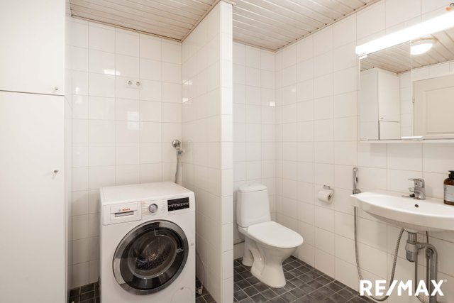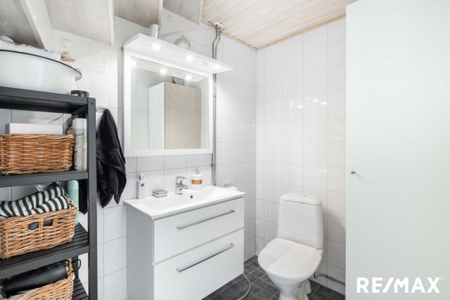 - WC-istuin, suihku, pesukoneliitäntä, lattialämmitys, peilikaappi, pesuallas, ja bidee-suihku