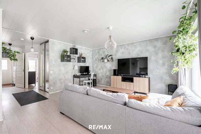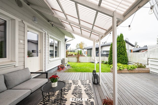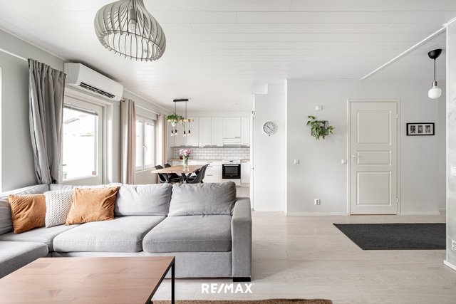 Asunnon sydämen muodostaa avara, yhtenäinen olohuone-/keittiötila, jossa on tilaa sekä arjen oleskelulle että perheen tai ystävien yhteisille hetkille. Olohuoneesta avautuvat isot ikkunat ja suora käynti omalle aidatulle pihalle. Päätyasunnon ansiosta piha on poikkeuksellisen suuri ja osittain valokatteella katettu terassi tarjoaa täydellisen paikan kesäpäivien ruokailuille ja rentoutumiselle.