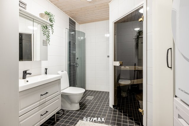 - WC-istuin, suihku, suihkuseinä, pesukoneliitäntä, lattialämmitys, bidee-suihku, allaskaappi, peilikaappi, ja pesuallas