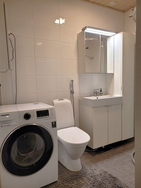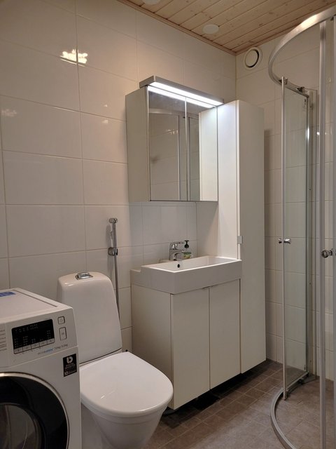- WC-istuin, suihku, lattialämmitys, pesukoneliitäntä, peilikaappi, pesuallas, ja allaskaappi