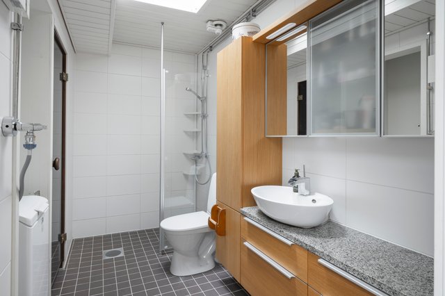 - WC-istuin, suihku, suihkuseinä, pesukoneliitäntä, lattialämmitys, peilikaappi, pesuallas, ja allaskaappi