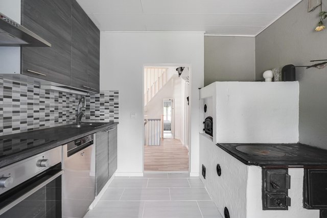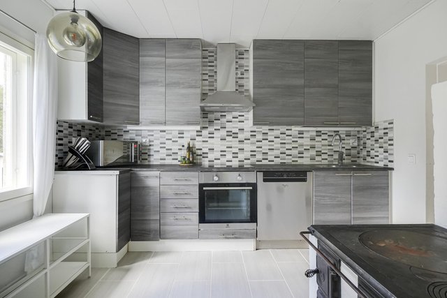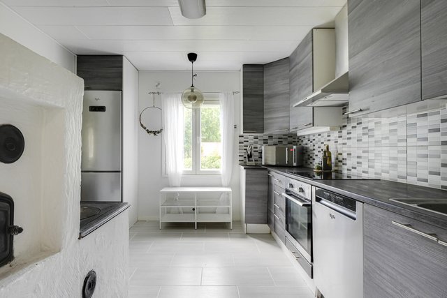 - Erillisuuni, jääkaappipakastin, liesi, astianpesukone, ja leivinuuni, puuhella