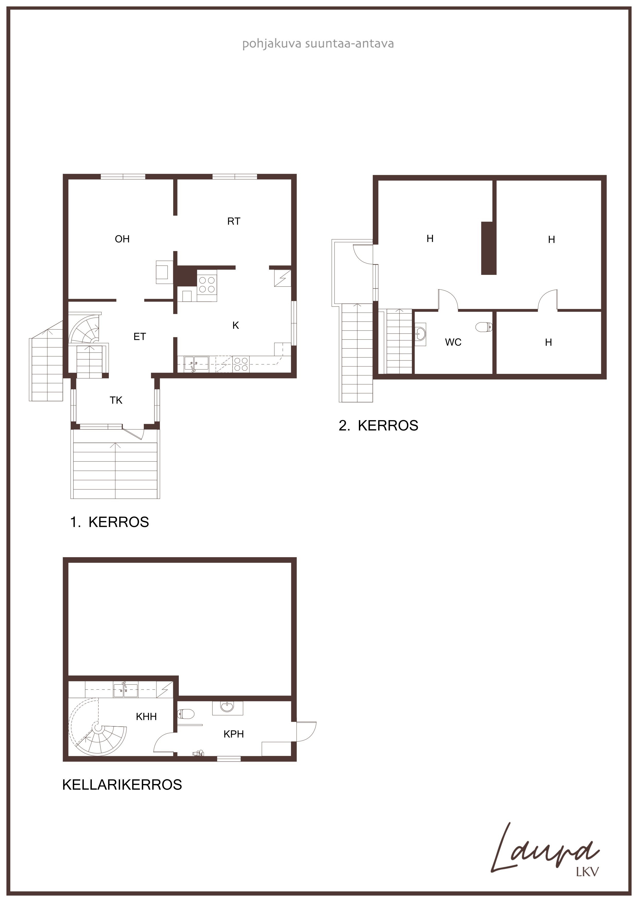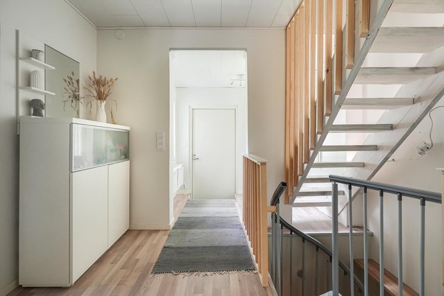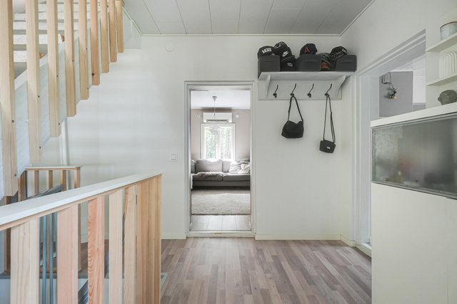 Kolmeen kerrokseen jakautuva talo on muuttovalmis, ja jokaisessa kerroksessa on oma sisäänkäynti, fiksu ratkaisu, sillä talon sisäportaat ovat hieman jyrkät.