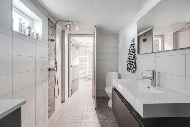 - Allaskaappi, suihkuseinä, suihku, wc-istuin, lattialämmitys, ja peili