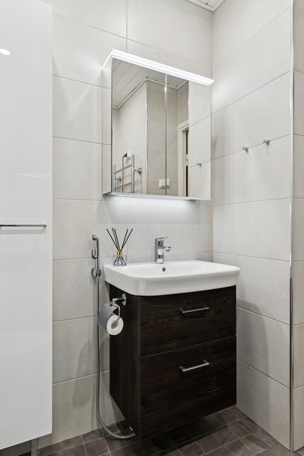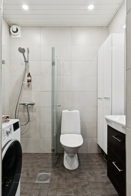 - Pesukoneliitäntä, suihkuseinä, suihku, wc-istuin, lattialämmitys, ja peilikaappi