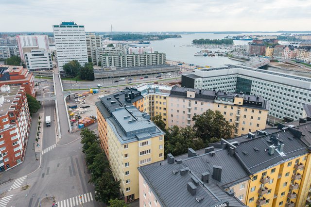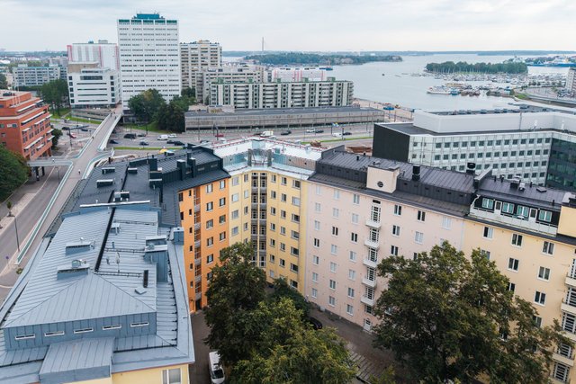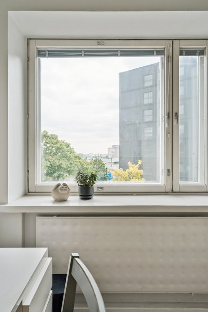 - Olohuoneesta kulmaikkunasta valoisat näkymät Merihakaan, Kalasatamaan, Kruununhakaan päin.