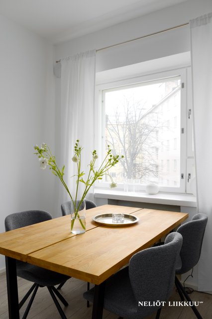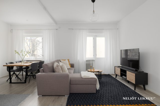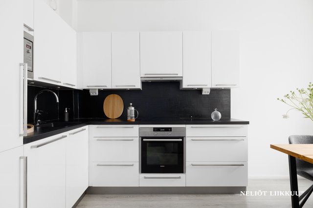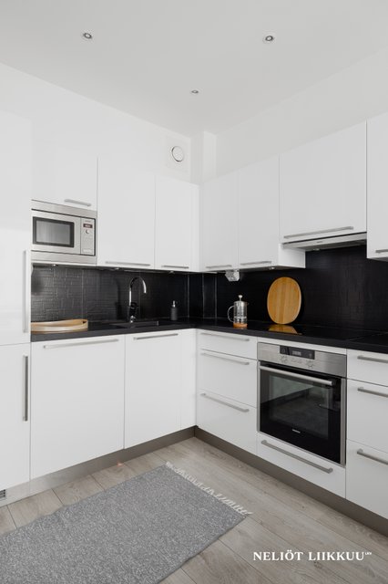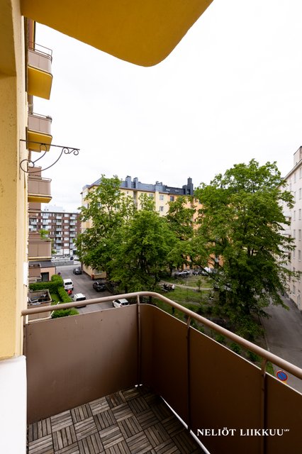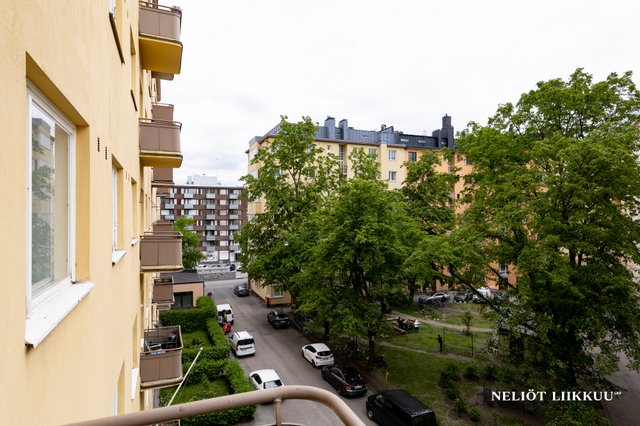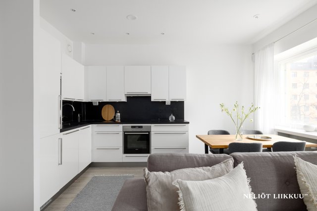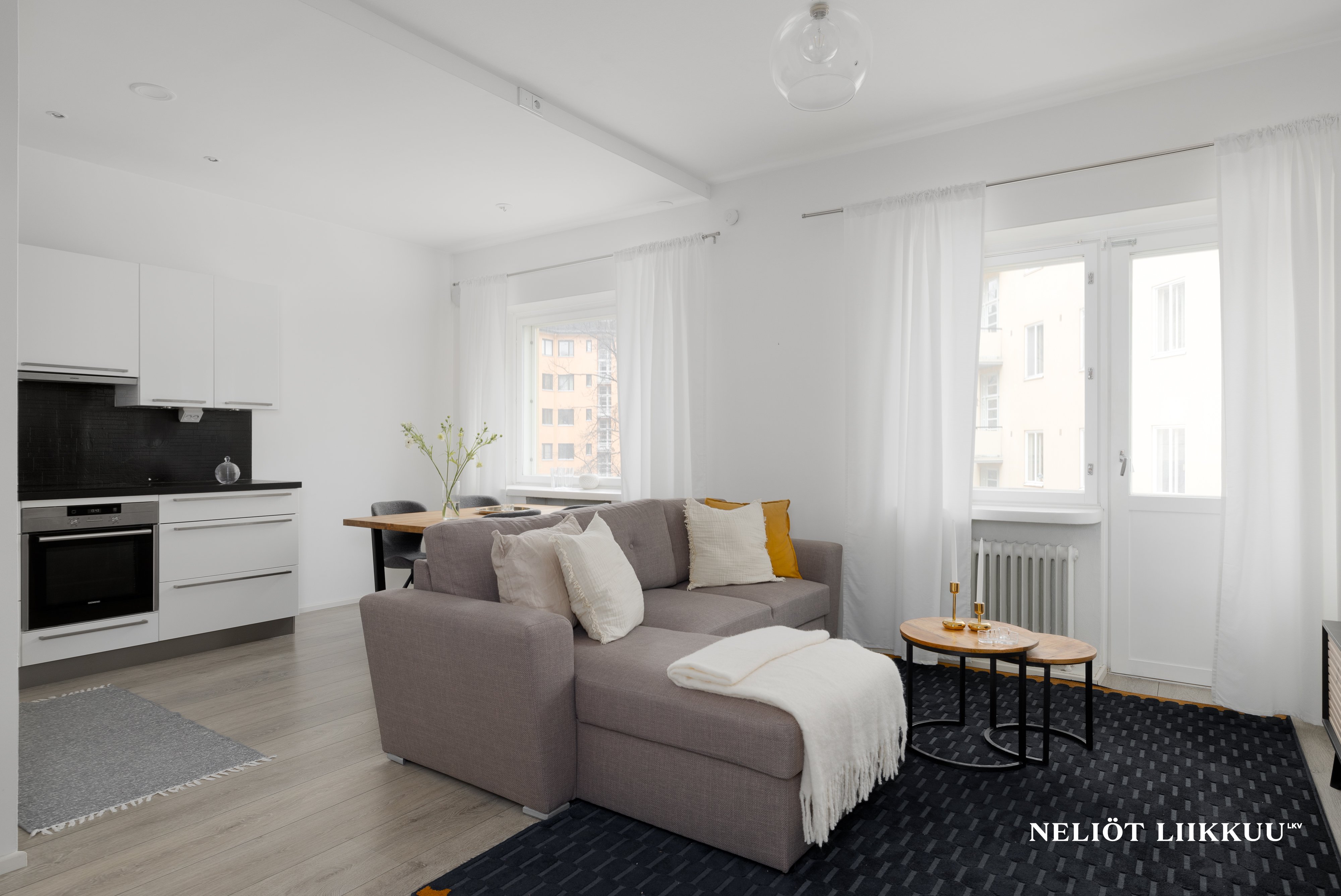 Tilava olohuone toimii kodin sydämenä, jonka yhteydessä on hyvin varusteltu keittiö, josta löydät paljon lasku- ja kaappitilaa. Keittiön yhteydessä on ruokailutila, johon mahtuu isompikin ruokailuryhmä. Asunnon ehdottomiin kohokohtiin kuuluu myös oma parveke, joka on harvinaista näillä alueilla. Kaikki asunnon ikkunat ja parveke ovat Hakaniemenkujan suuntaan.