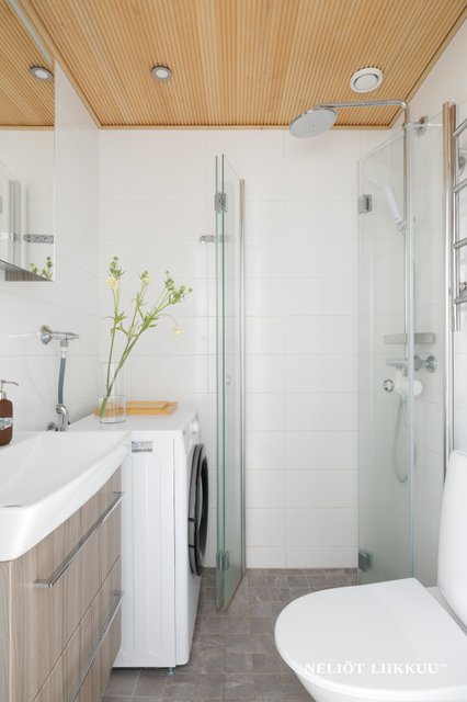 - Suihkuseinä, pesukoneliitäntä, sadesuihku, lattialämmitys (sähkötoiminen), kylpyhuonekaapisto, wc-istuin, ja peilikaappi