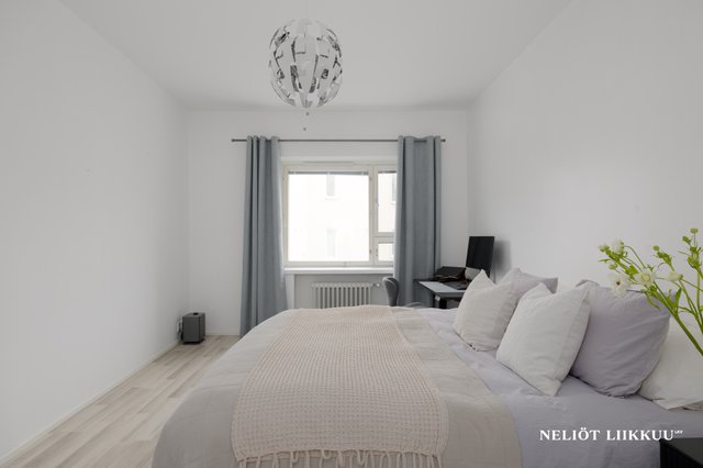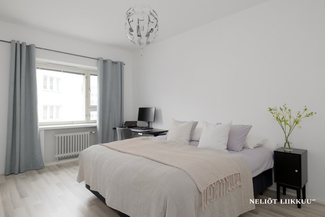 - Sälekaihtimet (makuuhuoneessa), verhotangot, kiinteät valaisimet (makuuhuoneen vaatehuoneessa).