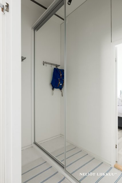 Asunnosta löydät myös tilavan makuuhuoneen, jonka yhteydessä on vaatehuone. Makuuhuoneessa on reilusti tilaa esimerkiksi omalle työpisteelle. Hyväkuntoisesta kylpyhuoneesta löydät kaiken tarvittavan sekä myös paikan pesukoneelle. Tässä kodissa on kaksi sisäänkäyntiä eteisauloineen ja kaappitiloineen. Toista eteistä voit käyttää esim. varastona tai työtilana.