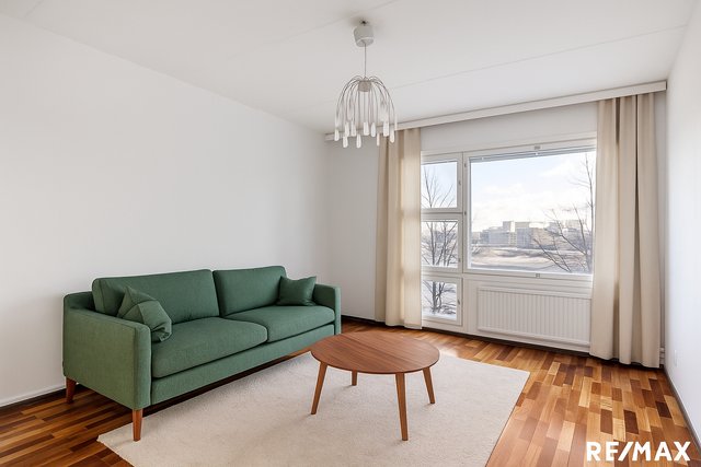 Tässä hissitalon toisen kerroksen kolmiossa on 71,5 neliötä. Tilavaan keittiöön mahtuu kokkaamaan hyvin ja ruokapöydälle on reilusti tilaa. Kauniina päivinä lasitettu parveke tarjoaa kaupunkinäkymän. Asunnossa on kaksi makuuhuonetta ja lisää säilytystilaa tuo vaatehuone.