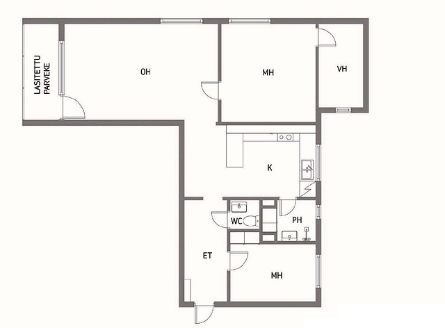- Peilikaappi, lattialämmitys, pesukoneliitäntä, ja kiinteät valaisimet