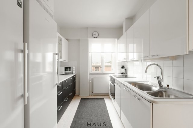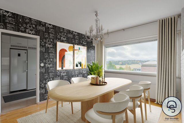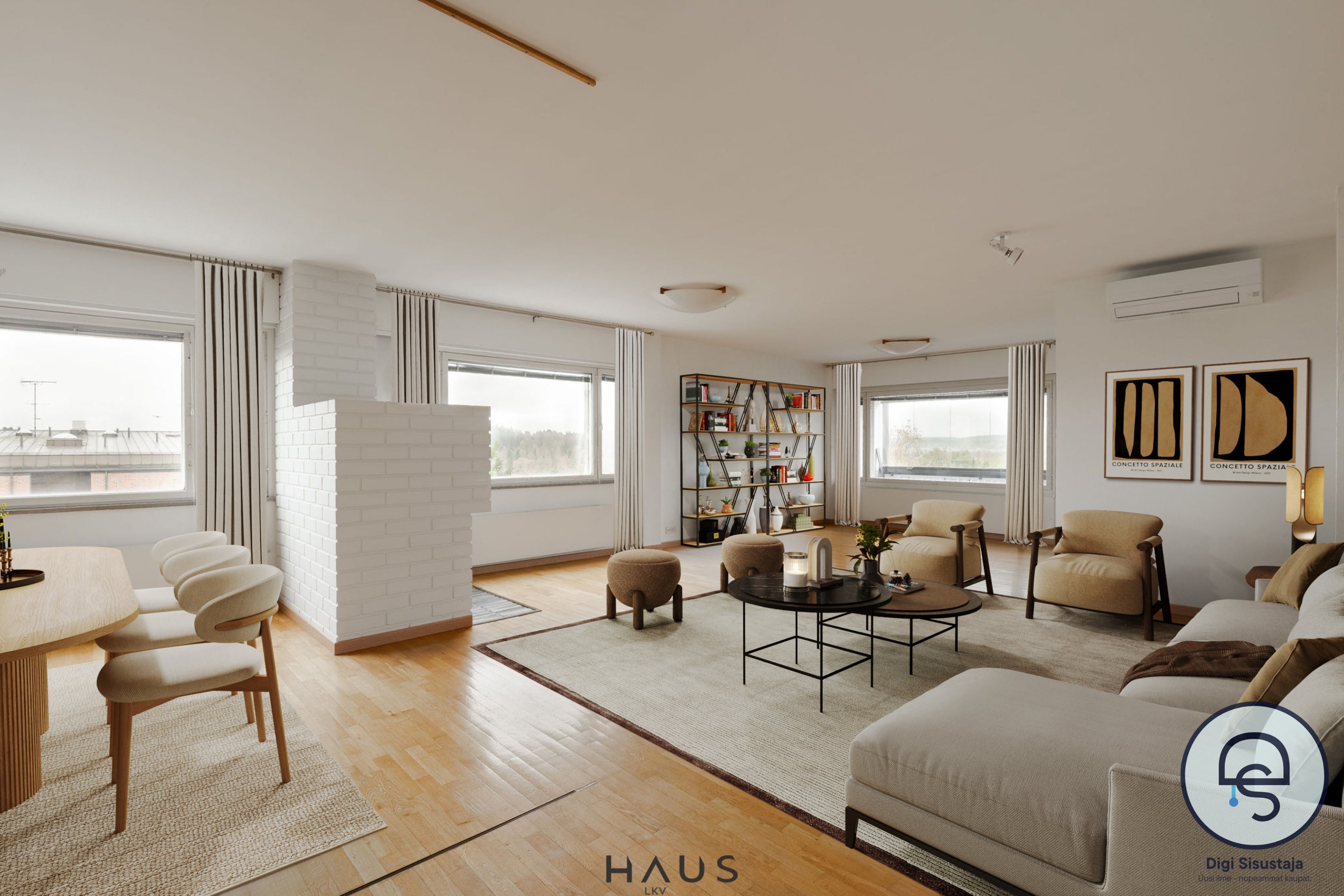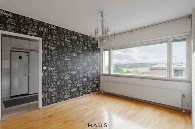 Asunto sijaitsee nelikerroksisen talon ylimmässä kerroksessa, joten näkymät ovat kauniit ja yksityisyys taattu. Tilava olohuone yhdistyy luontevasti ruokailutilaan, mikä tekee tilasta avaran ja kutsuvan. Olohuoneessa on tunnelmallinen takka, joka ei ole käyttökunnossa mutta luo tunnelmaa pimeneviin syysiltoihin. Erillinen keittiö tarjoaa runsaasti kaappi- ja laskutilaa ja tekee arjesta sujuvaa.