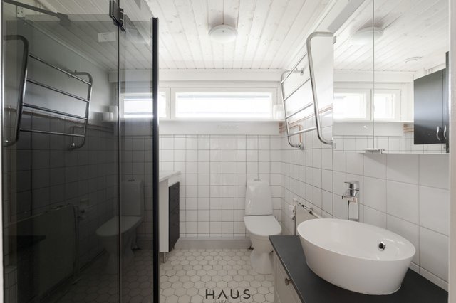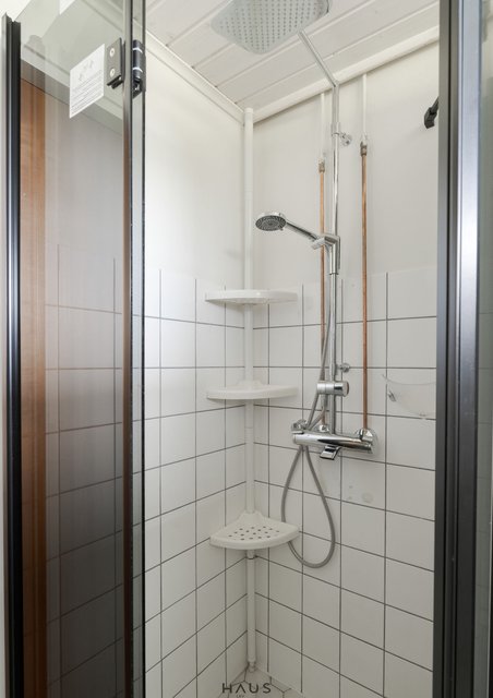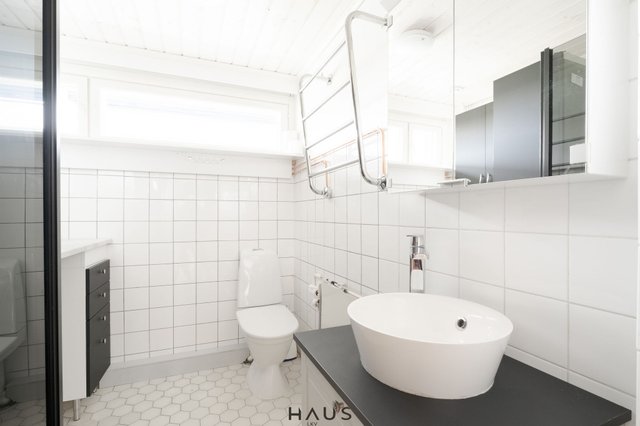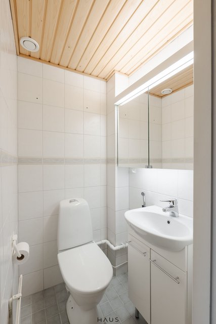 - WC-istuin, suihkuseinä, pesukoneliitäntä, pesuallas, allaskaappi, peilikaappi, ja pyyhepatteri
