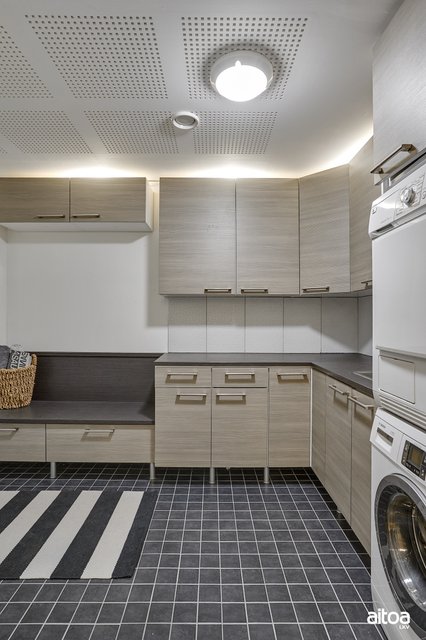 - Pesukoneliitäntä, pöytätaso, tila pesutornille, pesuallas, silityspöytä/taso, ja pyykkikaapit