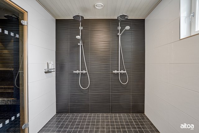 - Saunaosasto alakerrassa, jossa kaksi suihkua.