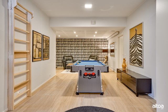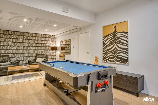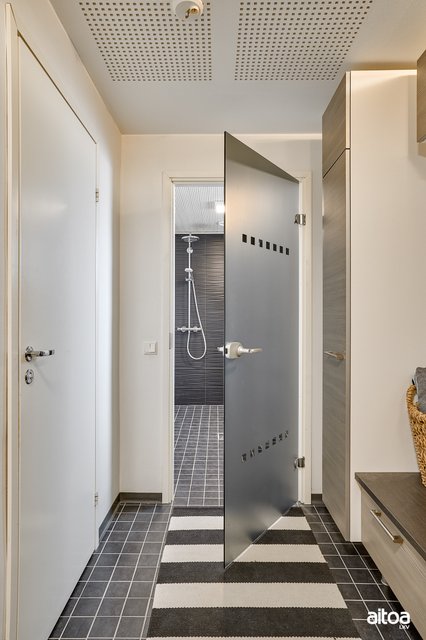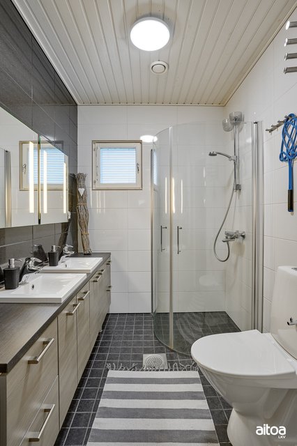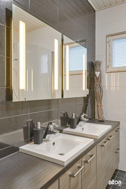 Alakerrassa sijaitsee viihtyisä saunaosasto kahdella suihkulla ja yläkerrassa on toinen kylpyhuone, joten tilat muovautuvat erinomaisesti eri tarpeisiin. Tilat kahdessa tasossa tuovat myös rauhaa kotona töitä tekevälle. Kaksi autotallia (toinen lämmin ja toinen kylmä) ja useat varastotilat takaavat, että säilytystilaa on riittävästi.
