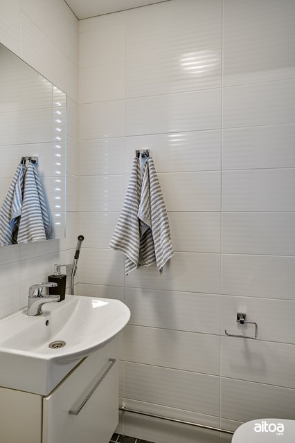 - WC-istuin, suihku, suihkuseinä, pesuallas, allaskaappi, peili, ja bidee-suihku