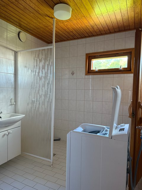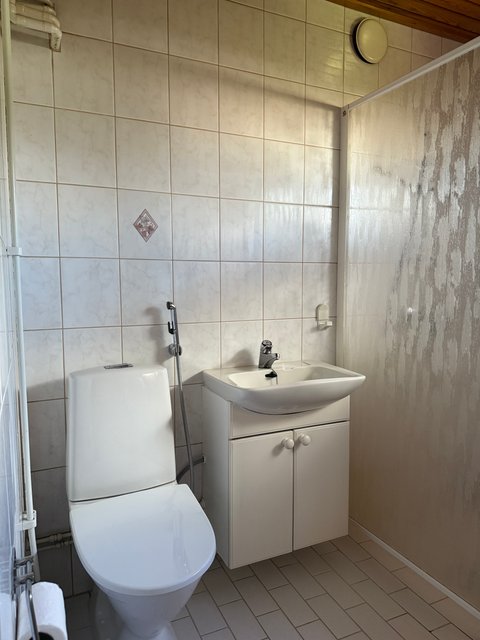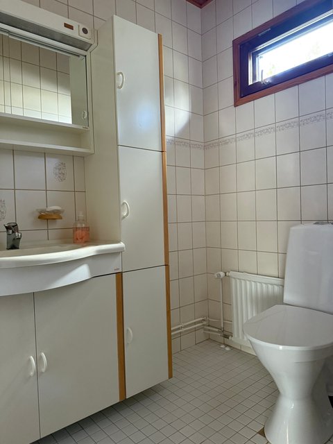 - WC-istuin, suihku, suihkuseinä, pesukoneliitäntä, pesuallas, allaskaappi, ja bidee-suihku