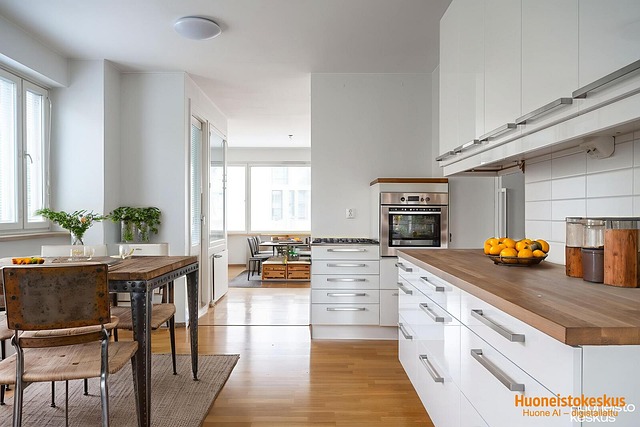 Keittiöstä ja toisesta makuuhuoneesta on väliseinät purettu ja näin on saatu mahtavasti avaraa tilaa, joka antaa paljon vaihtoehtoja sisustamiseen. Tilava keittiö on kokkaajan unelma, runsaasti tasotilaa sekä hyvät vetolaatikot. Tänne mahtuu suurempikin seurue ruokailemaan.