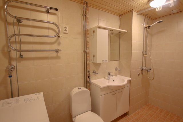- WC-istuin, suihku, allaskaappi, pesuallas, peilikaappi, ja bidee-suihku
