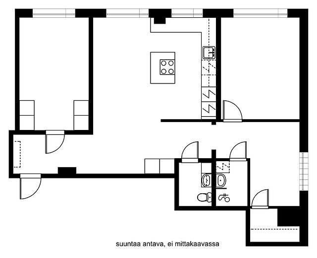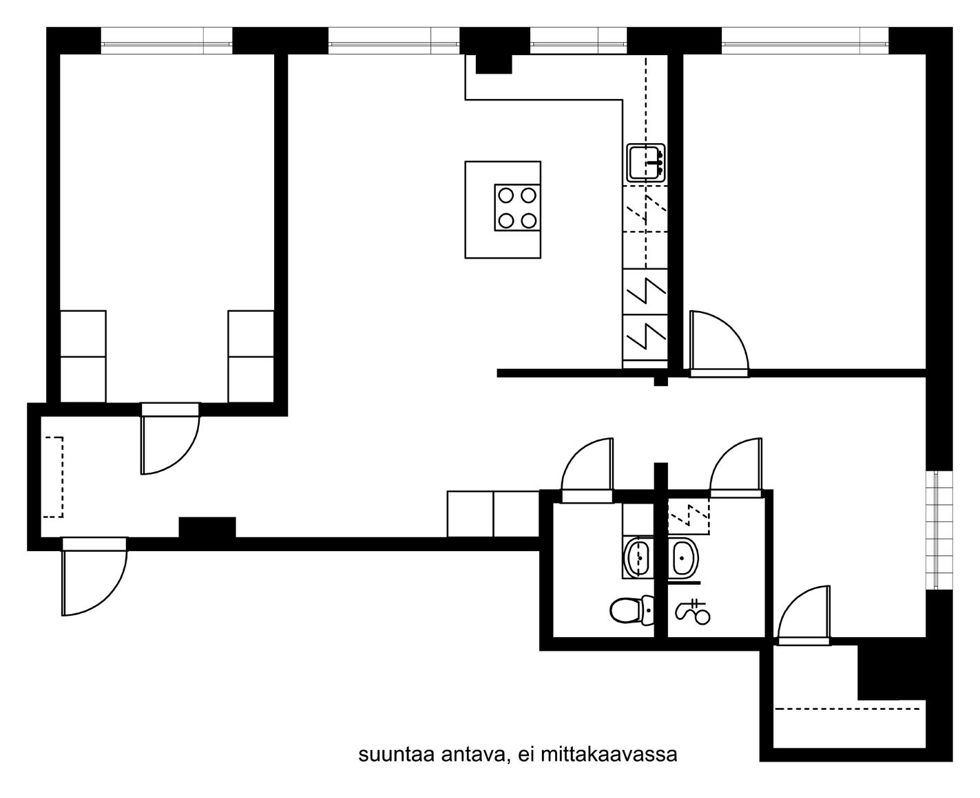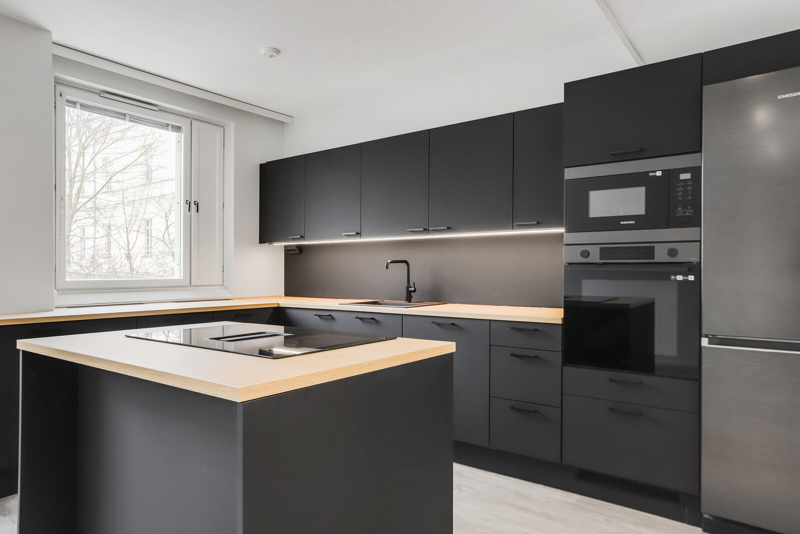 Hieno Keittiö: Kodin keskipisteenä komeilee täysin varusteltu musta keittiö, jossa on induktiolieteen integroitu liesituuletin ja muutakin modernia varustelua. Täällä ruoanlaitto sujuu vaivattomasti ja tyylikkäästi.