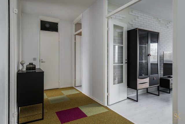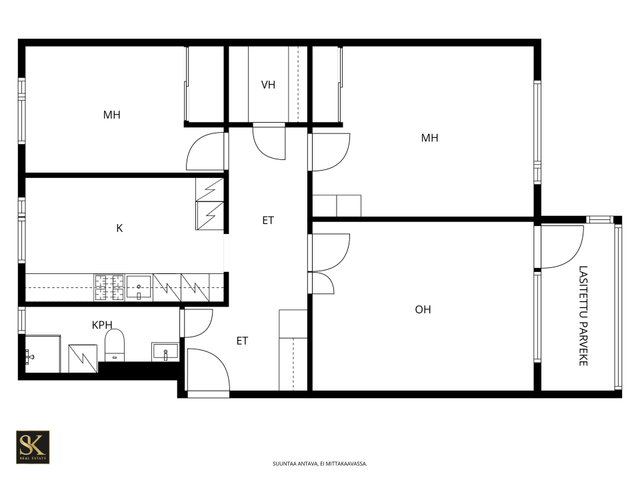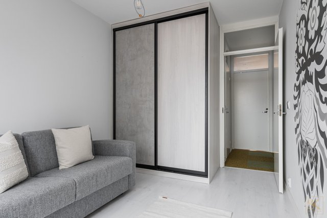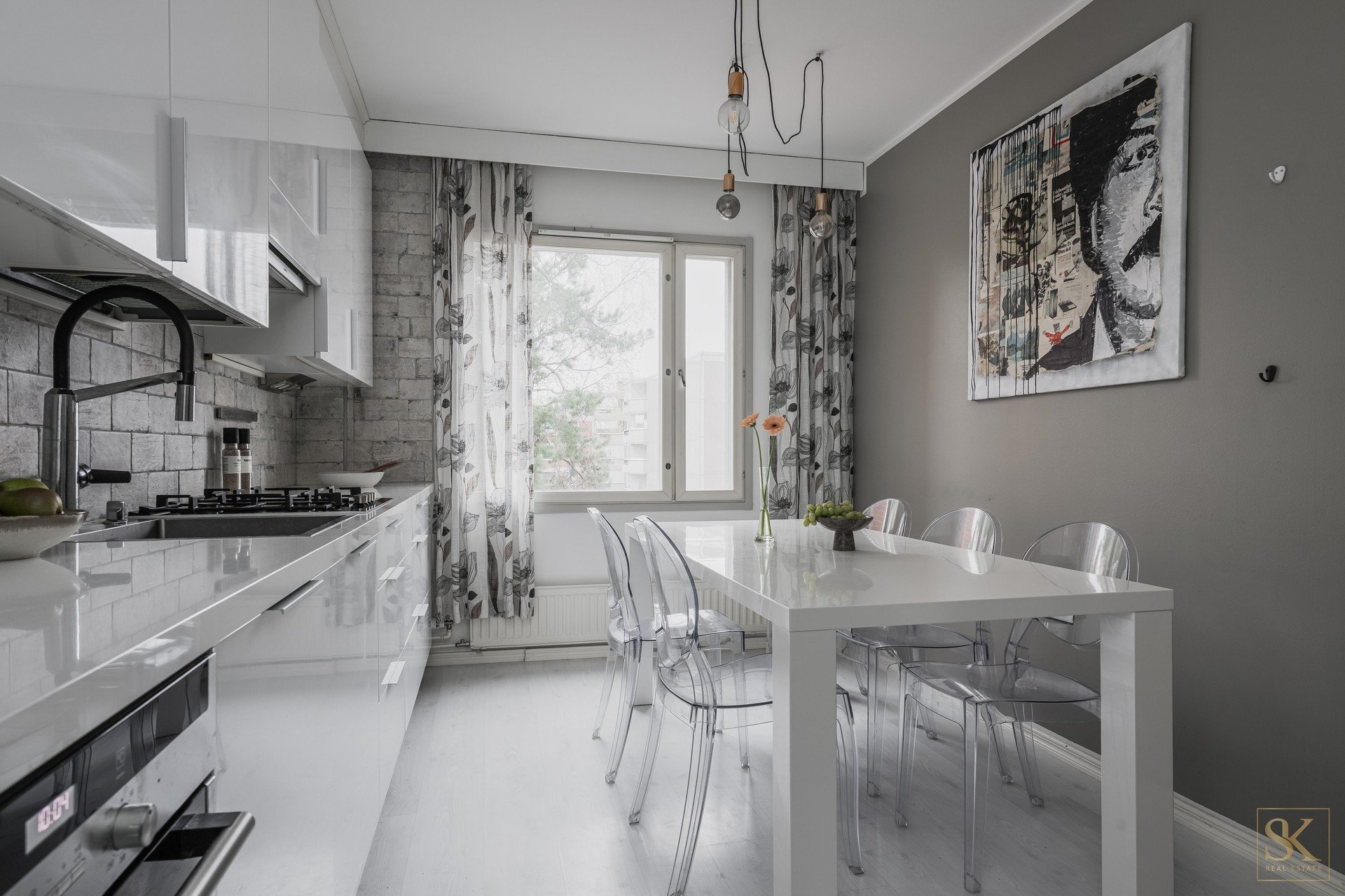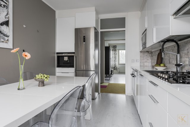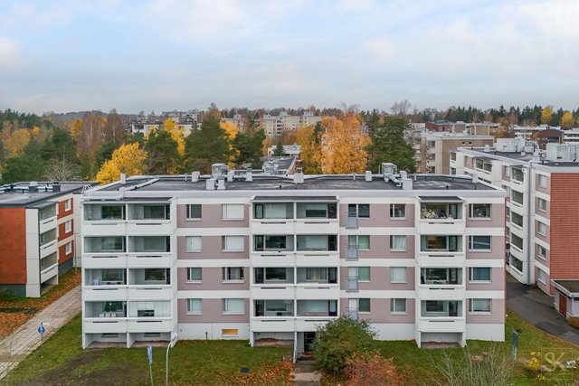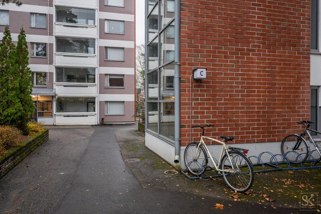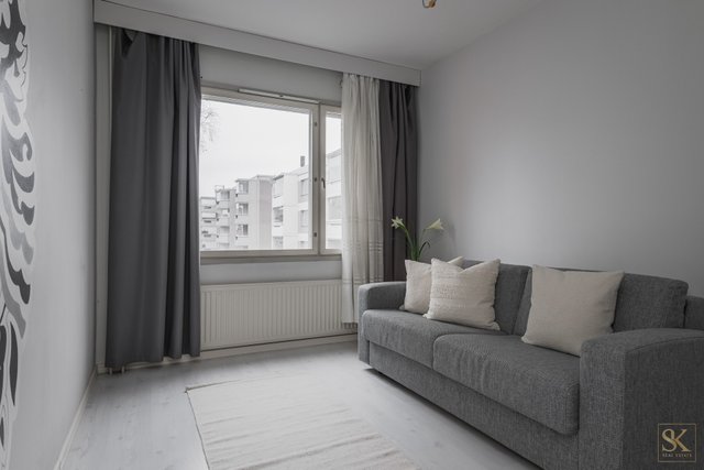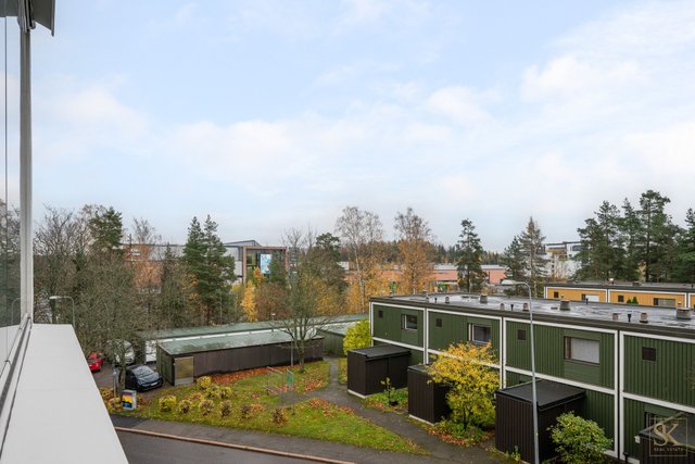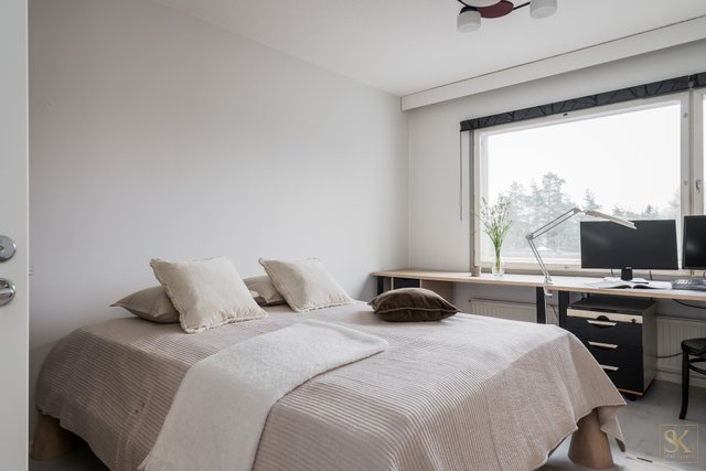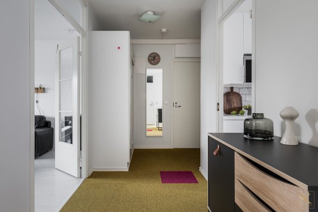 Tässä kolmannen kerroksen huoneistossa on kaksi makuuhuonetta sekä viihtyisä olohuone, josta on käynti lasitetulle parvekkeelle. Keittiö on varustettu laadukkailla Charmia-kalusteilla, integroiduilla kodinkoneilla ja kaasuliedellä. Kylpyhuone on uusittu vuonna 2024 linjasaneerauksen yhteydessä.