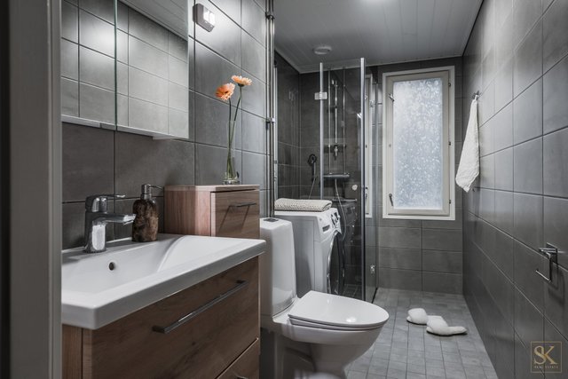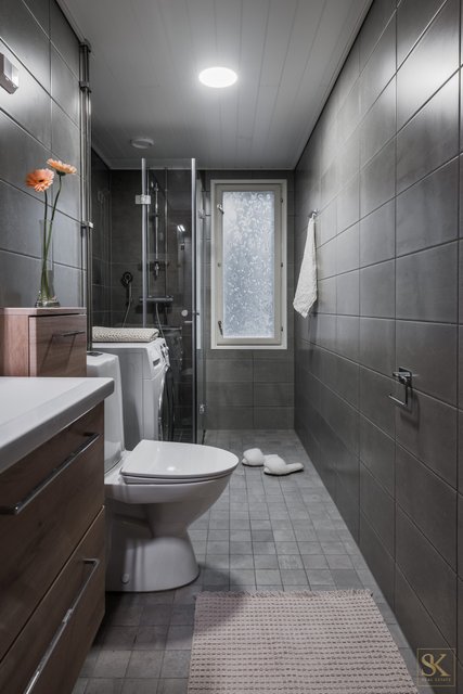 - WC-istuin, suihku, suihkuseinä, pesukoneliitäntä, lattialämmitys, pesuallas, allaskaappi, peilikaappi, ja bidee-suihku