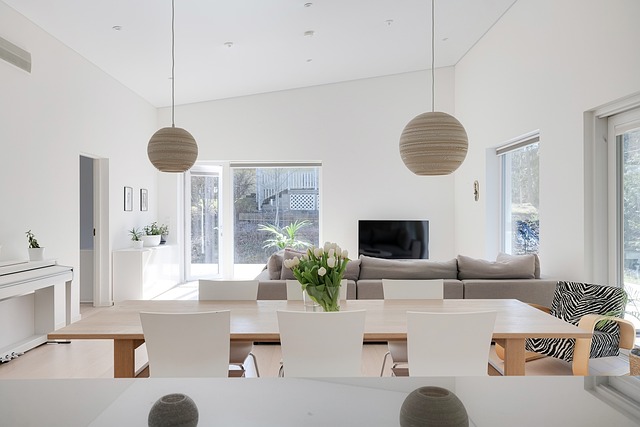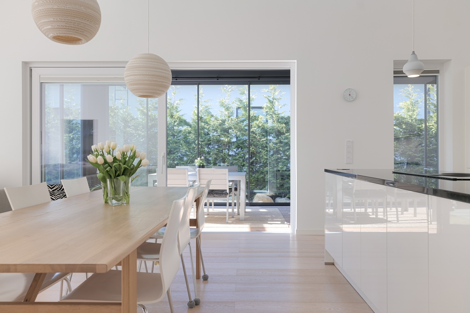 Tämän näyttävän kodin sydän avautuu heti eteisestä: suurten ikkunoiden kehystämä oleskelutila ja ruokailualue sulautuvat saumattomasti toisiinsa.