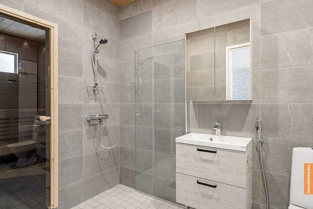 - Suihku, käännettävä suihkuseinä, pesuallas, allaskaappi, peilikaappi, wc-istuin. Lattia laattaa ja seinät kaakelia.